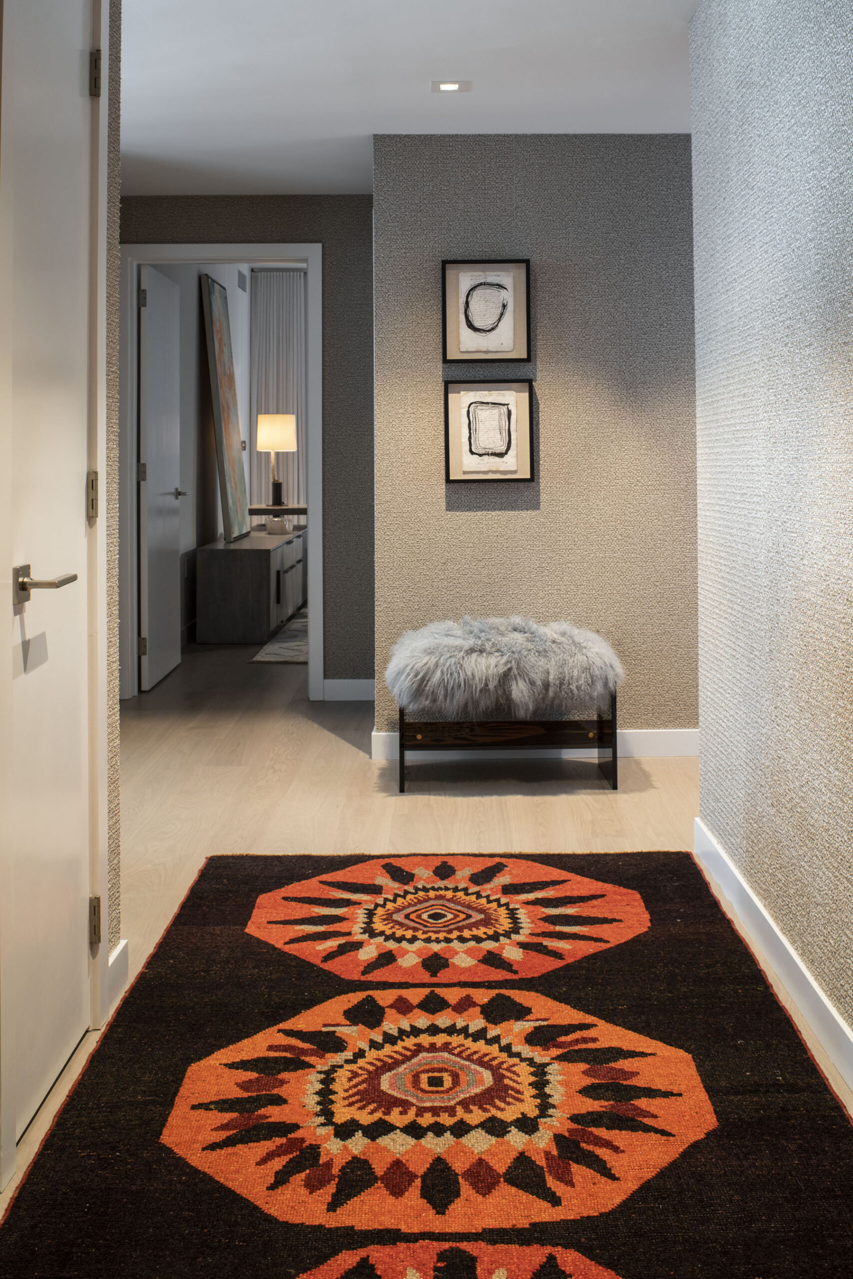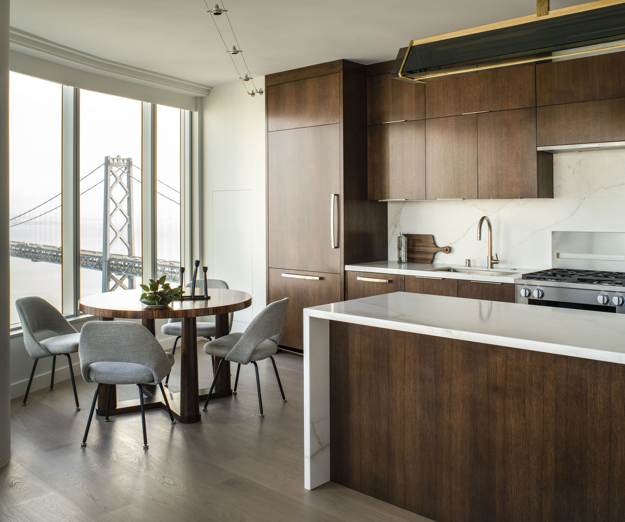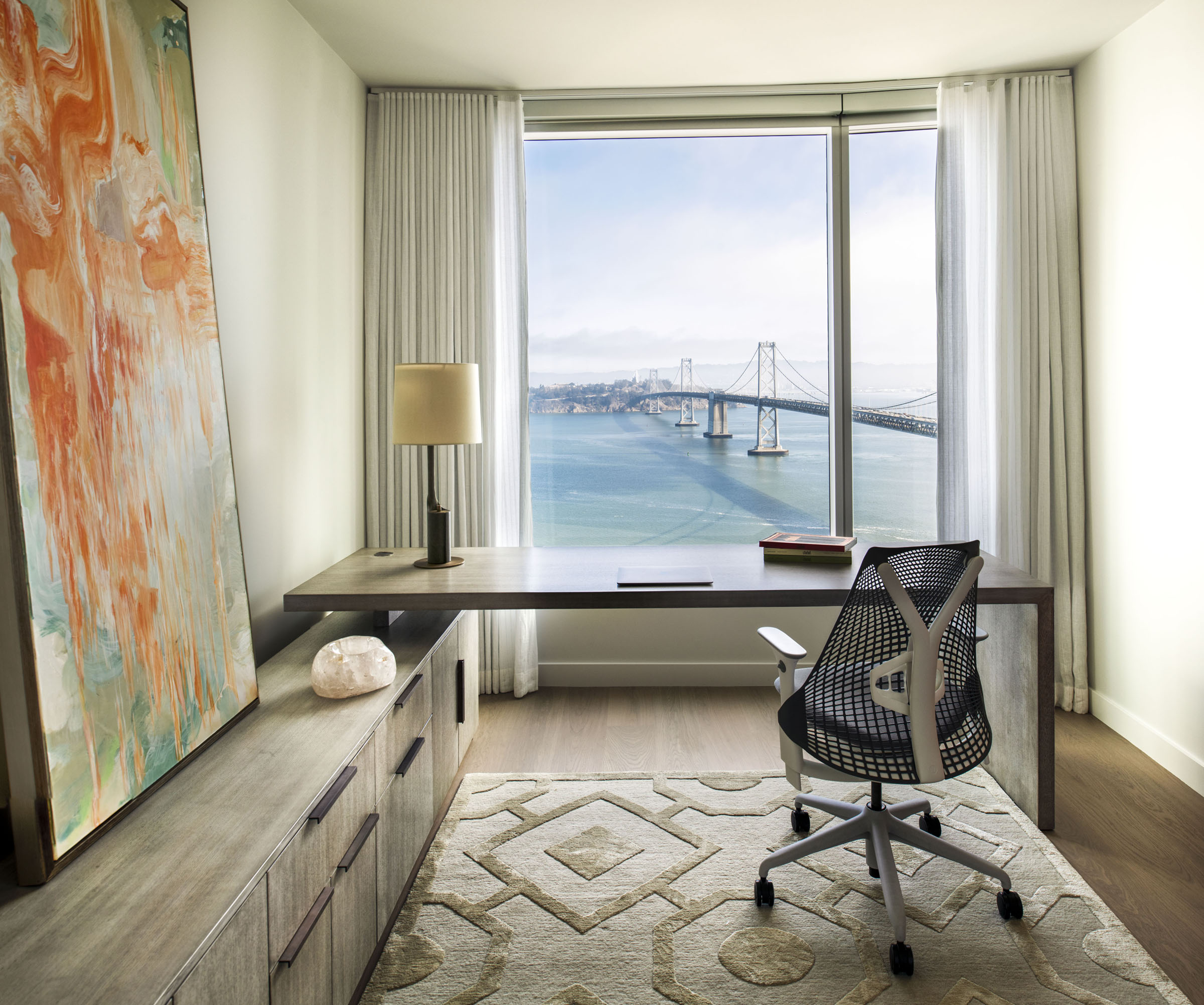 In our latest design, a little vision led to a lot of stunning views. Our client was considering selling their San Francisco pied-a-terre in favor of new construction. We came in to provide a second opinion and immediately envisioned what it could be—an elegant, modern retreat with first-class views of the bay. That said, we knew we would need to do a complete gut remodel to accomplish the kind of results we wanted. We got to work on a total redesign, re-imagining and updating the layout of the entire space. We designed custom cabinetry and furniture throughout, layering quiet elegance into every room. We let the views take center stage and complemented them with a variety of neutral textiles and textures. We added both color and intrigue with gorgeous Indian rugs, one of which is crafted out of vintage saris. Thassos flooring, Phillip Jeffries wallpaper, art by John Mayberry and beautiful custom window treatments add just the right amount of visual luxe. And we even devised a way to bypass the complex infrastructure of a high-rise to install a freestanding tub in the master bathroom.