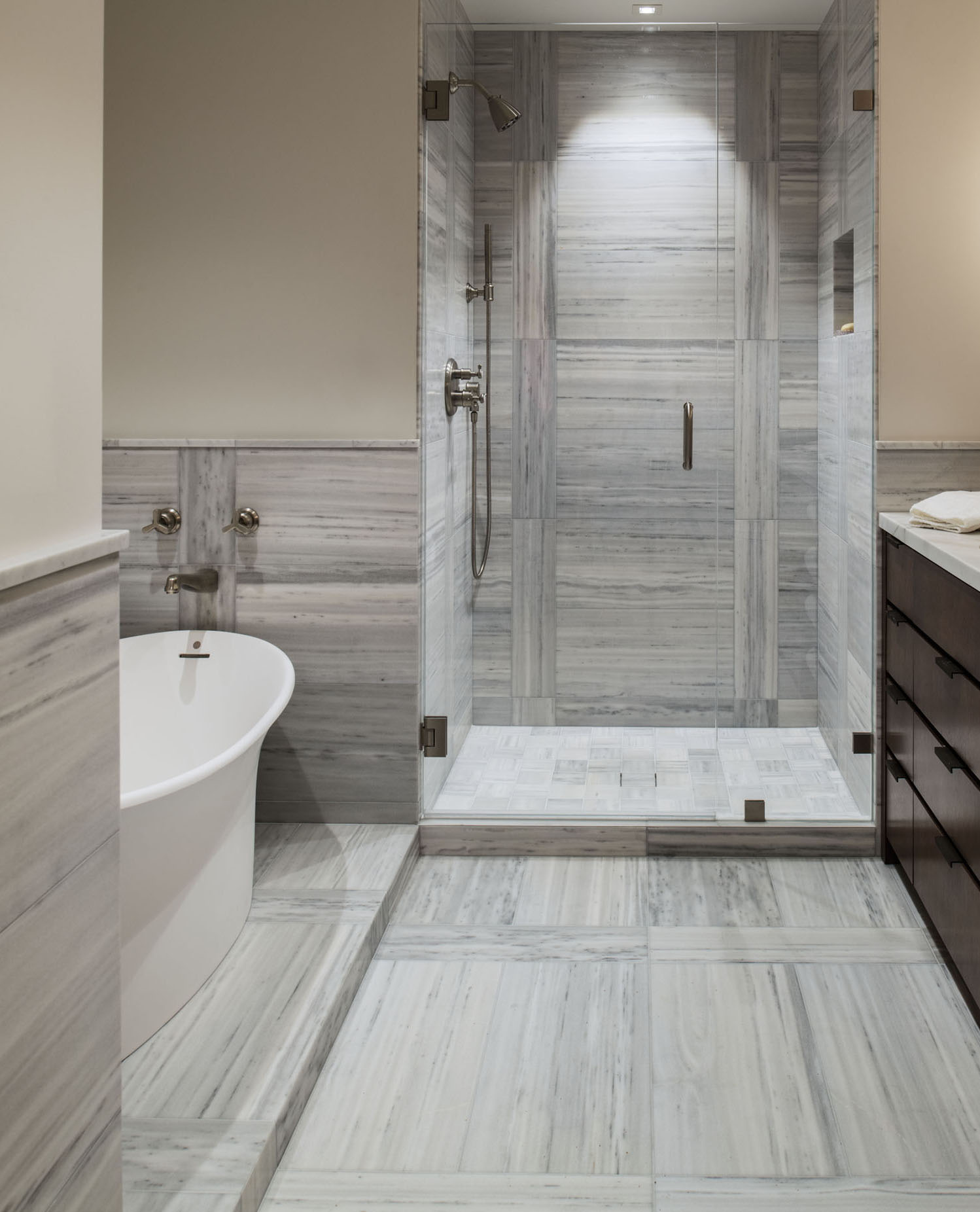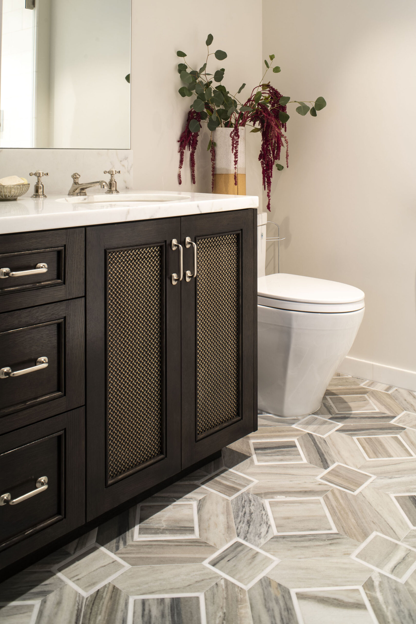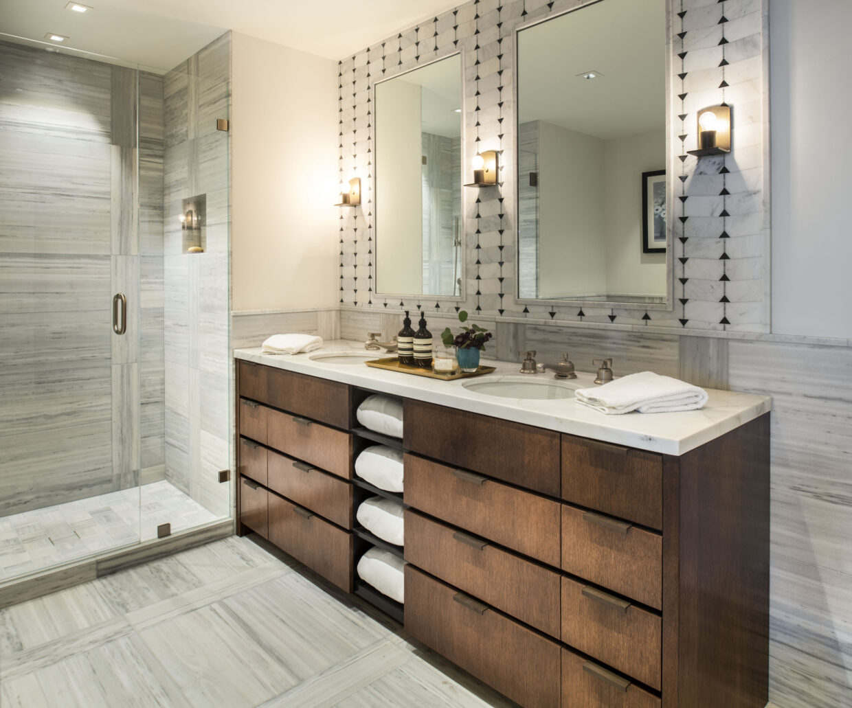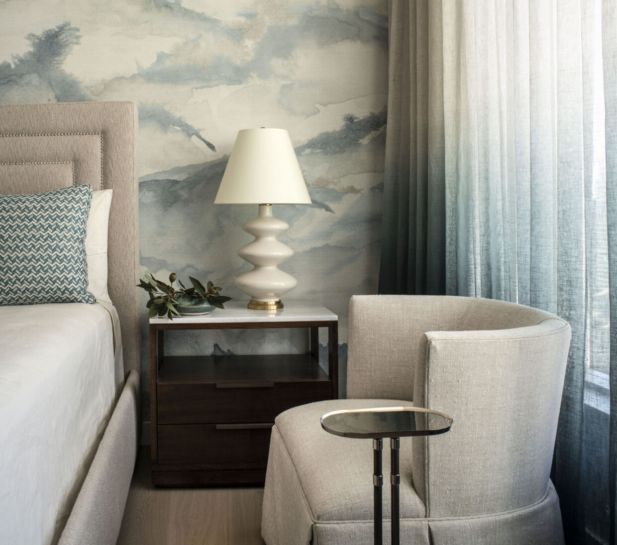 In our latest design, a little vision led to a lot of stunning views. Our client was considering selling their San Francisco pied-a-terre in favor of new construction. We came in to provide a second opinion and immediately envisioned what it could be—an elegant, modern retreat with first-class views of the bay. That said, we knew we would need to do a complete gut remodel to accomplish the kind of results we wanted. We got to work on a total redesign, re-imagining and updating the layout of the entire space. We designed custom cabinetry and furniture throughout, layering quiet elegance into every room. We let the views take center stage and complemented them with a variety of neutral textiles and textures. We added both color and intrigue with gorgeous Indian rugs, one of which is crafted out of vintage saris. Thassos flooring, Phillip Jeffries wallpaper, art by John Mayberry and beautiful custom window treatments add just the right amount of visual luxe. And we even devised a way to bypass the complex infrastructure of a high-rise to install a freestanding tub in the master bathroom.